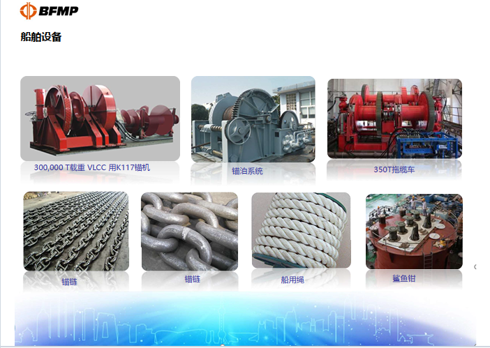 公司為客戶(hù)提供各種錨纜機(jī)、拖纜機(jī)、吊機(jī)、舷梯、開(kāi)艙機(jī)、錨、錨鏈及船舶內(nèi)外舾裝。