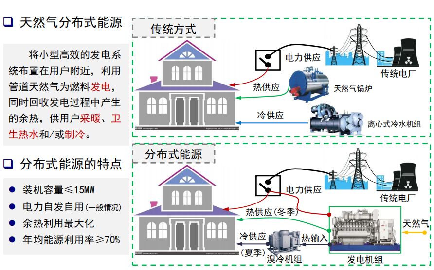 分布式能源是指分布在用戶端的能源綜合利用系統(tǒng)。它以天然氣等清潔能源為主要一次能源,通過冷熱電三聯(lián)供等方式實現(xiàn)能源的梯級利用,綜合能源利用效率可達70%以上。與傳統(tǒng)的集中式能源供應(yīng)相比,分布式能源具有更高的能源利用效率、更低的能源輸送損耗和更強的能源供應(yīng)靈活性。